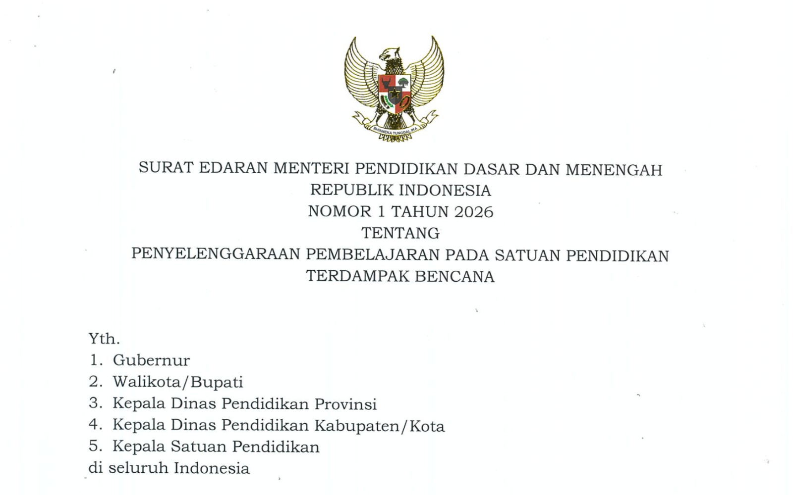 JAKARTA, Bhayangkara101.co.id – Kementerian Pendidikan Dasar dan Menengah (Kemendikdasmen) menerbitkan Surat Edaran Menteri Pendidikan Dasar dan Menengah Nomor 1 Tahun 2026 tentang Penyelenggaraan Pembelajaran pada Satuan Pendidikan Terdampak Bencana. Kebijakan ini menjadi acuan nasional bagi pemerintah daerah dan satuan pendidikan dalam memastikan keberlangsungan layanan pendidikan di tengah situasi darurat akibat bencana alam, sekaligus memastikan pemenuhan hak dasar para siswa untuk mendapatkan pendidikan.