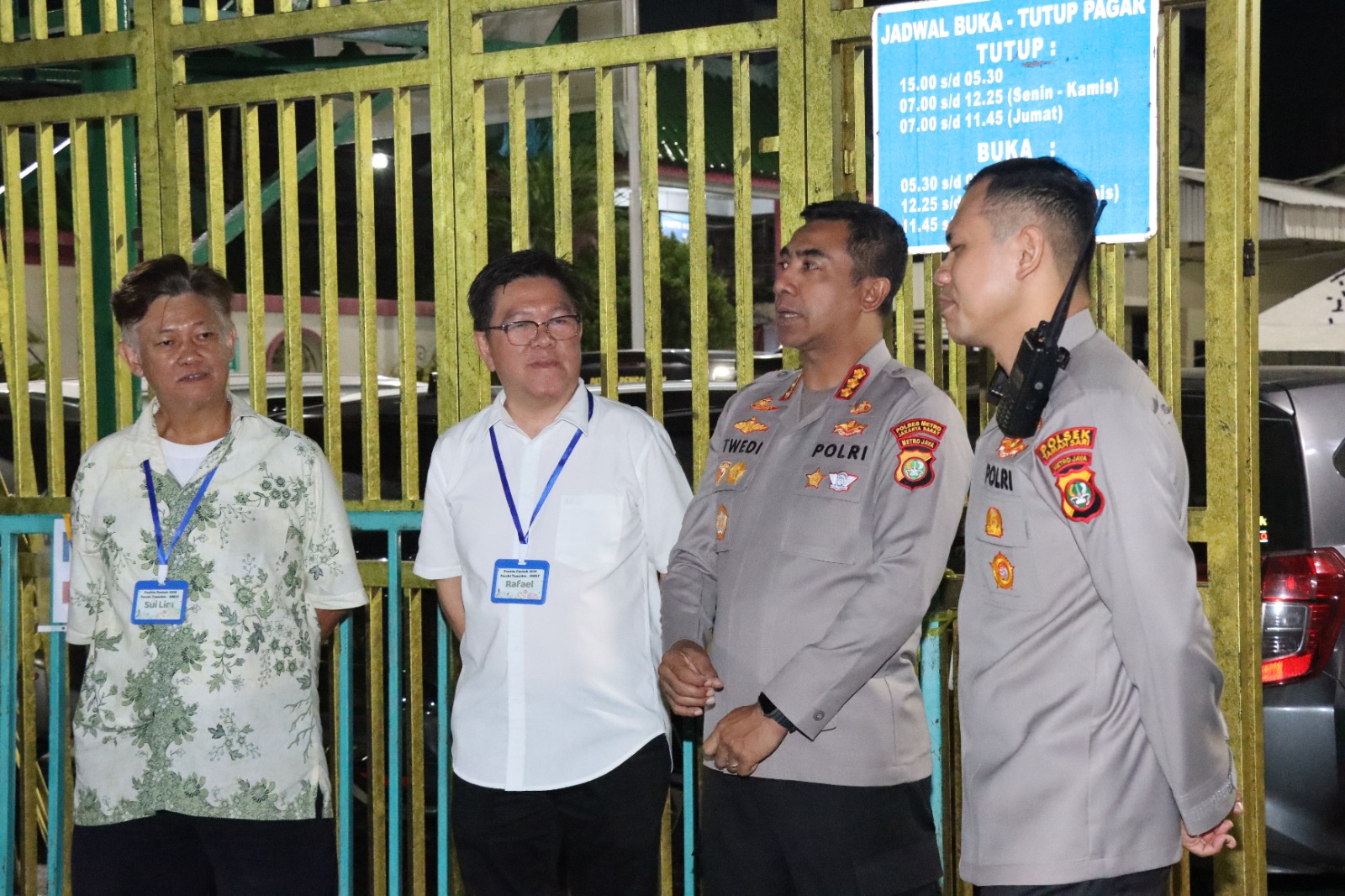 Kapolres Metro Jakarta Barat Kombes Pol. Twedi Aditya Bennyahdi melaksanakan kunjungan monitoring pengamanan di Gereja Katolik ST. Maria De Fatima / Ricci, yang berlokasi di kawasan Glodok, Tamansari, Jakarta Barat, Sabtu (4/4/2026) malam.